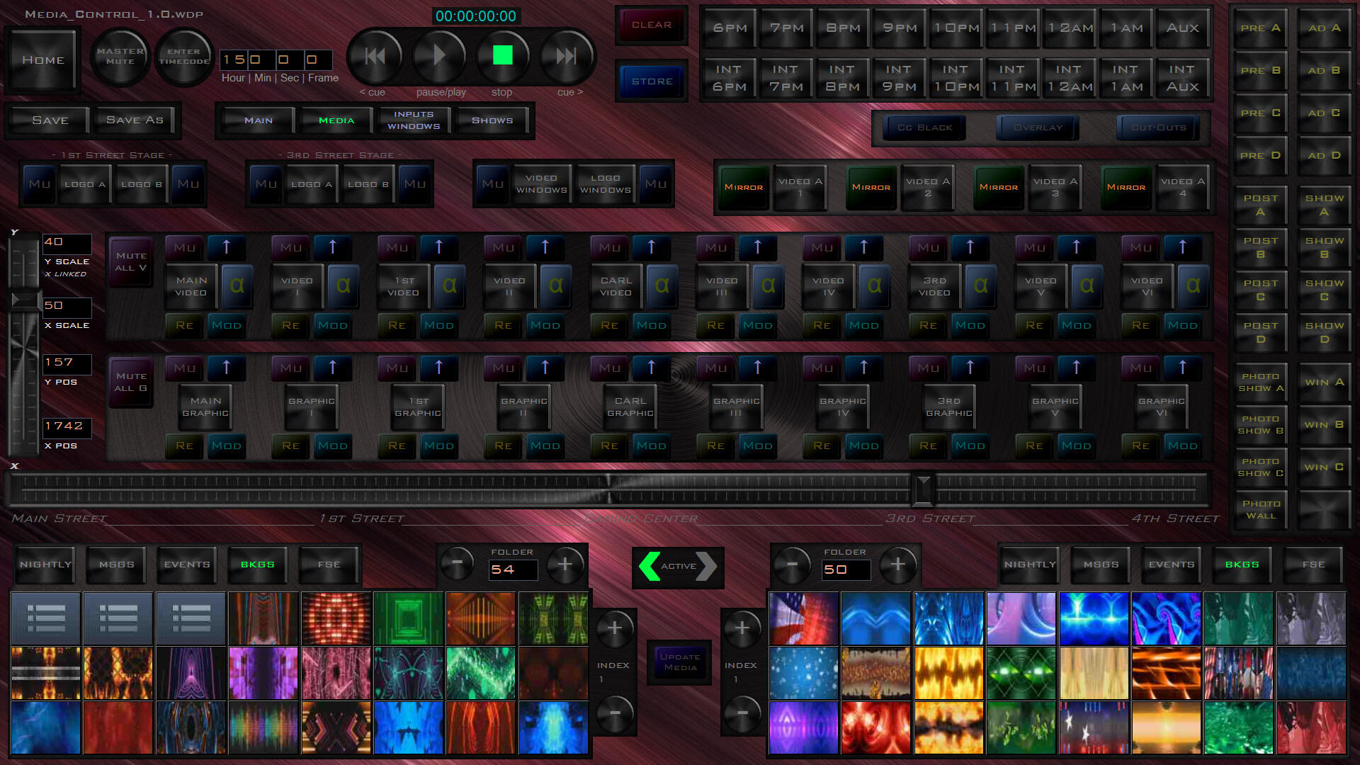 When Fremont Street Experience transitioned to Pandoras Box in 2013, I led the design and programming of a new show control system supporting the Viva Vision canopy and surrounding stages. Drawing on years of experience with the venue’s technical environment, I built a flexible, operator-friendly ecosystem that improved reliability, introduced real-time automation, and expanded what was creatively possible across the 1,500-foot LED display.